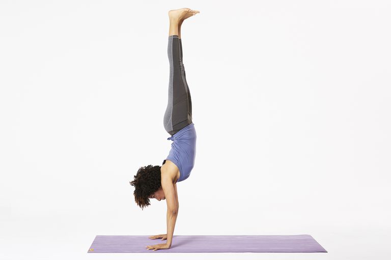 Doing a handstand facing the wall can be helpful because it encourages you to “hug your core muscles.” You need to hug the entire body into your centerline to prevent falling over away from the wall. To come out of the pose, walk your hands forward on the ground, walk your feet down the wall, and end in a child’s pose.