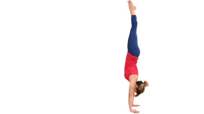 Step 3: You will arrive in a handstand position with your hands a few inches from the wall and the tops of your feet pressing into the wall. Play with pressing your feet away from the wall to hold a free-standing handstand.