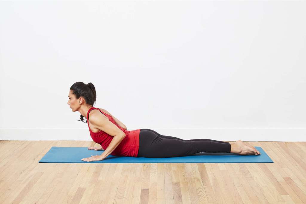 To perform this pose, lie flat on your stomach with hands extended forward and palms facing down. Now keep your hands right below your shoulders, lift your upper body and look up. Your lower abdomen and thighs should be flat on the floor.