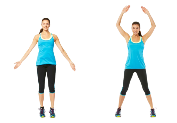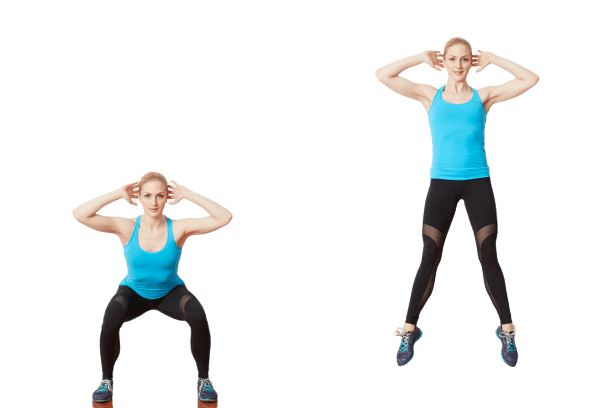 With feet wide, lower into a deep squat and extend arms out to the sides of shoulders, palms facing up. Jump up out of squat, bringing feet together and clapping hands overhead. That’s one rep. Do 20 reps as fast as possible.