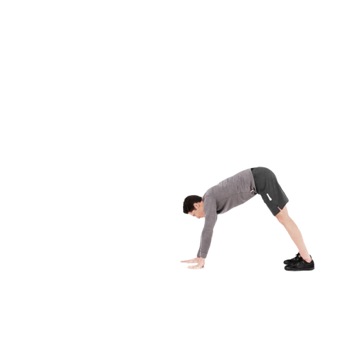 Stand with feet hip-width apart and keep core tight. Bend from your waist, place hands on the floor, and walk hands forward, keeping legs straight. When you arrive in a high plank, quickly walk hands back toward feet and stand.